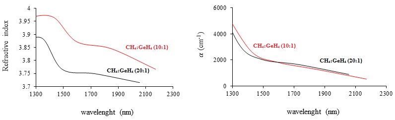 In this research, Germanium-carbon coatings were deposited on ZnS substrates by plasma enhanced chemical vapor deposition (PECVD) using GeH4 and CH4 precursors. Optical parameters of the Ge1-xCx coating such as refractive index, Absorption coefficient, extinction coefficient and band gap were measured by the Swanepoel method based on the transmittance spectrum. The results showed that the refractive index of the Ge1−xCx coatings at the band of 2 to 2.2 µm decreased from 3.767 to 3.715 and the optical gap increased from 0.66 to 0.72 eV as CH4:GeH4 increases from 10:1 to 20:1.